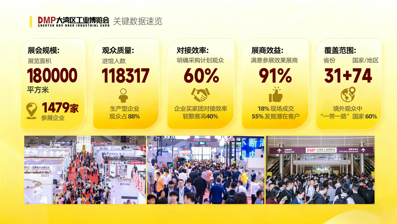 2019DMP移师深圳国际会展中心,将DMP展全面升级为DMP大湾区工业博览会(简称“工博会”),是享有“华南工业展览第一展”之称的DMP国际模具、金属加工、塑胶及包装展(简称“DMP展”)的全面升级版,从东莞战略转移到大湾区“核心引擎”深圳。首届工博会展会规模20万平方(10个展馆),国内外参展企业数量1848家,展期观展人数132790人,展出范围:数控机床、智能制造系统、工业机器人、钣金激光、压铸铸件、塑胶及包装、模具制造、工业物联网、工业测量、3D打印、精密零件、数字化工厂、工业大数据、人工智能、工业4.O等各个领域,涵盖原辅材料、关键零部件、先进制造装备、整体解决方案、个性化定制等智造产业链条全球最新技术及产品。